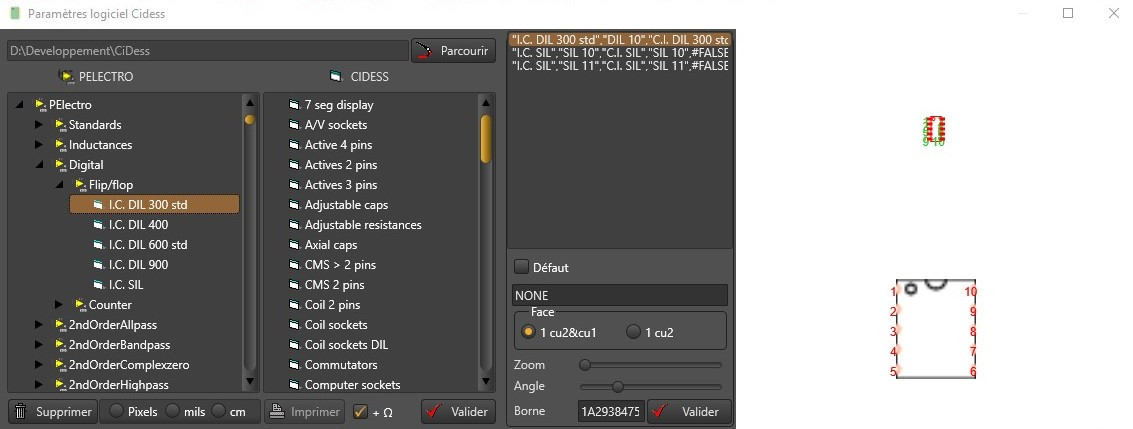 Sur la gauche un « arbre » permet de se déplacer sur les composants PElectro. Pour ouvrir une branche, il faut cliquer sur la flèche de la branche et pour la fermer il faut recliquer dessus. C’est au niveau le plus bas qu’il sera possible de mettre des catégories aux composants PElectro. Par exemple, le composant LM741 de type Ampli Op a reçu les catégories ‘I.C. DIL300 std’ à ‘I.C. DIL 900’ de CiDess. Il est possible de supprimer une catégorie CiDess attribuée à un composant PElectro en la sélectionnant côté PElectro et en cliquant sur le bouton Supprimer. Pour choisir la mesure du circuit, qui est affiché dans la fenêtre principale de l’application, il faut cliquer sur Pixels (mode par défaut), mil (mesure utilisée par CiDess) et cm.