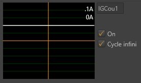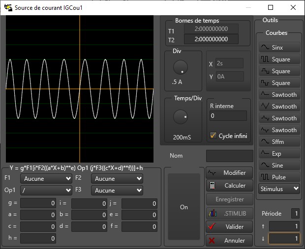 Le 5 A précise le nombre d’ampères par division. Il est calculé en fonction des informations saisies lors de la dernière modification de l’instrument. Les deux cases à cocher sont des informations sur l’état de l’instrument. ‘On’ signifie que l’instrument est en fonctionnement. ‘Cycle infini’ que les fonctions Y se répètent indéfiniment. Le bouton rotatif, permet de faire varier la hauteur de la courbe.