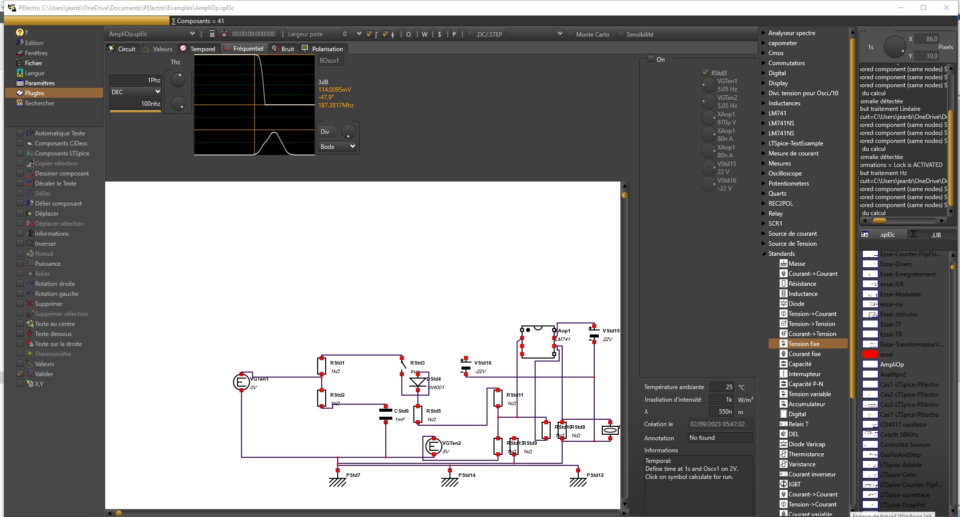 Simulation fréquentielle Seuls les composants ampèremètre et oscilloscope sont utilisés dans la simulation fréquentielle.