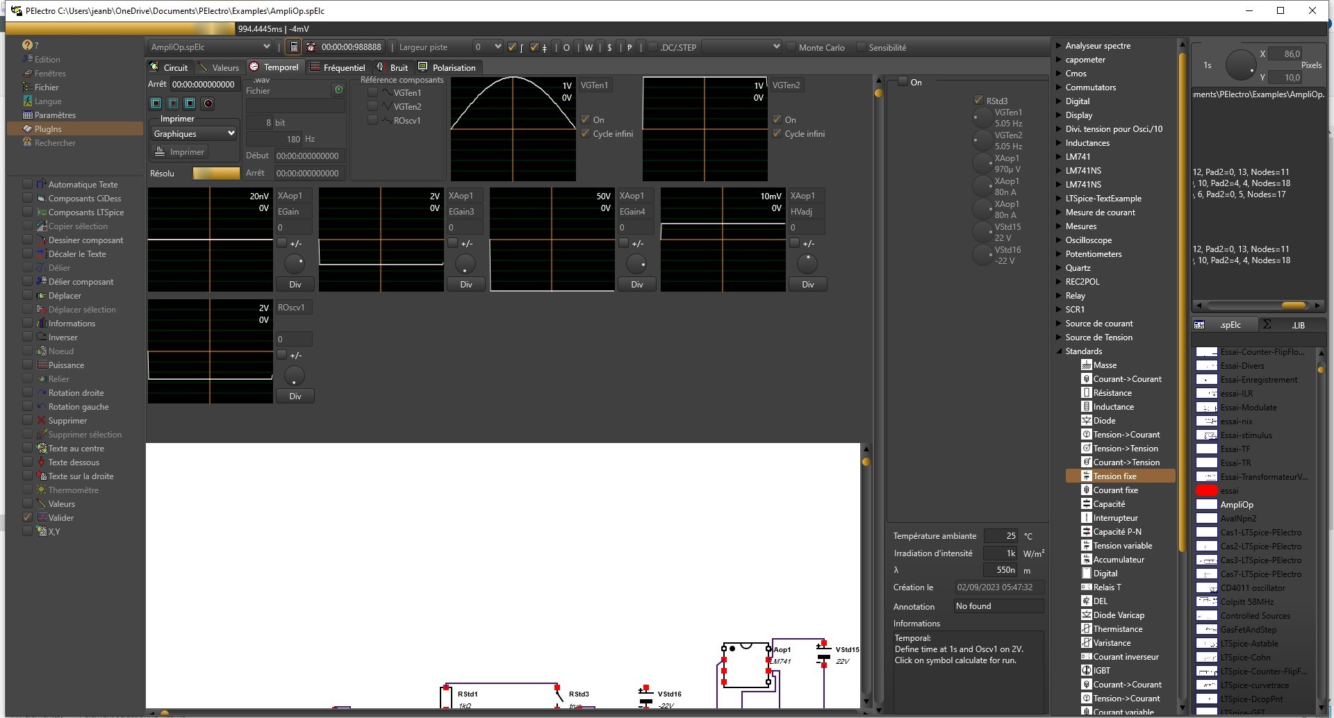 Il est impossible de sortir de PElectro lorsque l'on est sur les onglets de simulation. il faut revenir sur le circuit en cours pour pouvoir arrêter PElectro. Simulation temporelle Tous les instruments suivants sont utilisés lors des simulations.