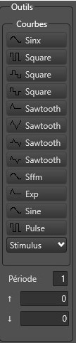 Cette fenêtre est composée de 2 parties : -La première, qui regroupe les courbes disponibles. Celle-ci s’affiche sur l’écran après la saisie de T2 et le clique sur l’une d’elles. -La seconde, permet d’indiquer le nombre de périodes (maximum 9) que va créer le programme. Les deux autres champs permettent de gérer l’amplitude du dessin. Dans le domaine fréquentiel Cet instrument s’affiche sous cette forme.