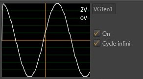 Le 50 V précise le nombre de volts par division. Il est calculé en fonction des informations saisies lors de la dernière modification de l’instrument. Les deux cases à cocher sont des informations sur l’état de l’instrument. ‘On’ signifie que l’instrument est en fonctionnement. ‘Cycle infini’ que les fonctions Y se répètent indéfiniment. Le bouton rotatif, permet de faire varier la hauteur de la courbe.