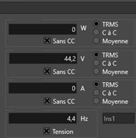 Les afficheurs : Le premier afficheur donne le nombre de watt. Ici 0 W. Pour que les watts soient affichés, il faut que la partie courant et la partie tension soient correctement connectées. Le second, le nombre de volts. Ici, 44,2 V. Le troisième, le nombre d’ampères. Ici, 0A. Le quatrième, la fréquence. Ici 4,4 Hz. Les mesures sont effectuées sur une période : TRMS ou mesure efficace vraie (True RMS). C à C, mesure crête à crête. Moyenne du cycle. La fréquence est donnée pour la tension si la case est cochée, sinon pour le courant.