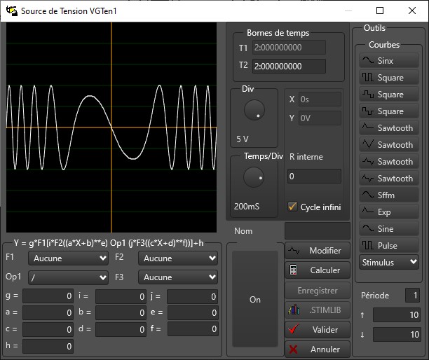 L'amplitude du signal est en volt. La phase est exprimée en degrés. La résistance interne en Ohms. La fréquence en Hz n’est pas disponible. Ces informations serviront lors de la simulation fréquentielle du circuit. Pour valider la saisie et quitter, cliquer sur le bouton 'Valider'. En simulation temporelle