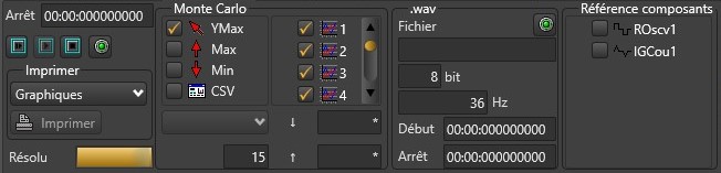 -‘Enregistrement’ permet (1er bouton à gauche) d’enregistrer la courbe qui est obtenue en simulation directe. Le second bouton (bouton ‘play’), lit la courbe qui a été enregistrée. Et le dernier bouton (bouton‘ stop’) arrête, soit l’enregistrement soit la lecture, de la courbe. La limite de temps est disponible dans ‘Arrêt’, si celui-ci est à zéro, il n’y a pas de limite dans le temps de simulation. Sinon, lorsque sa valeur est inférieure ou égale au temps de simulation, la simulation s’arrête ainsi que l’enregistrement.